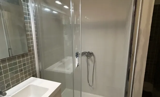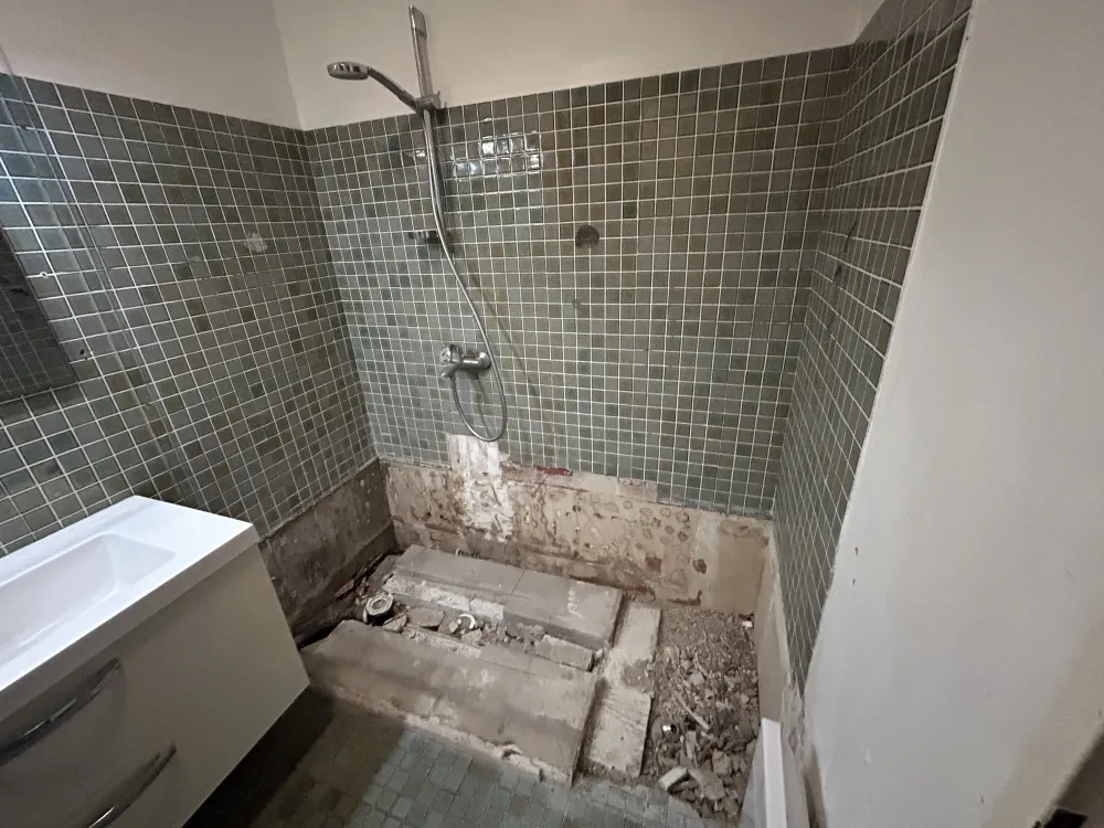 Votre plombier à Saint-Raphaël, est intervenu suite à une fuite d'eau d'une douche chez un particulier : remplacement du receveur d'origine par un receveur en résine puis réfection du carrelage de la douche, pose d'une cloison et pour finir, remplacement de la parois de douche coulissante.